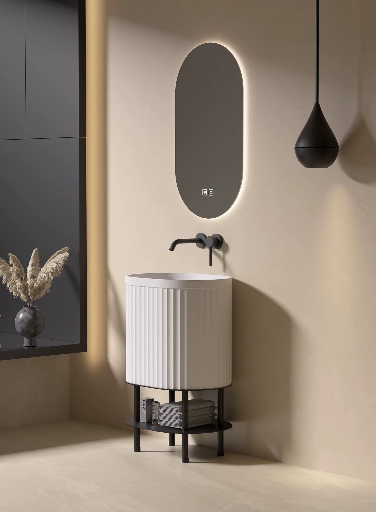 Das Waschtisch-Set „Onda“ ist eine Hommage an die ruhige Kraft des Wassers. Sein Design wird von den sanften, vertikalen Wellen geprägt, die die Außenseite des ovalen Beckens zieren. Diese feine Struktur erzeugt ein faszinierendes Spiel von Licht und Schatten und verleiht dem Waschtisch eine einzigartige, fast meditative Ausstrahlung.
